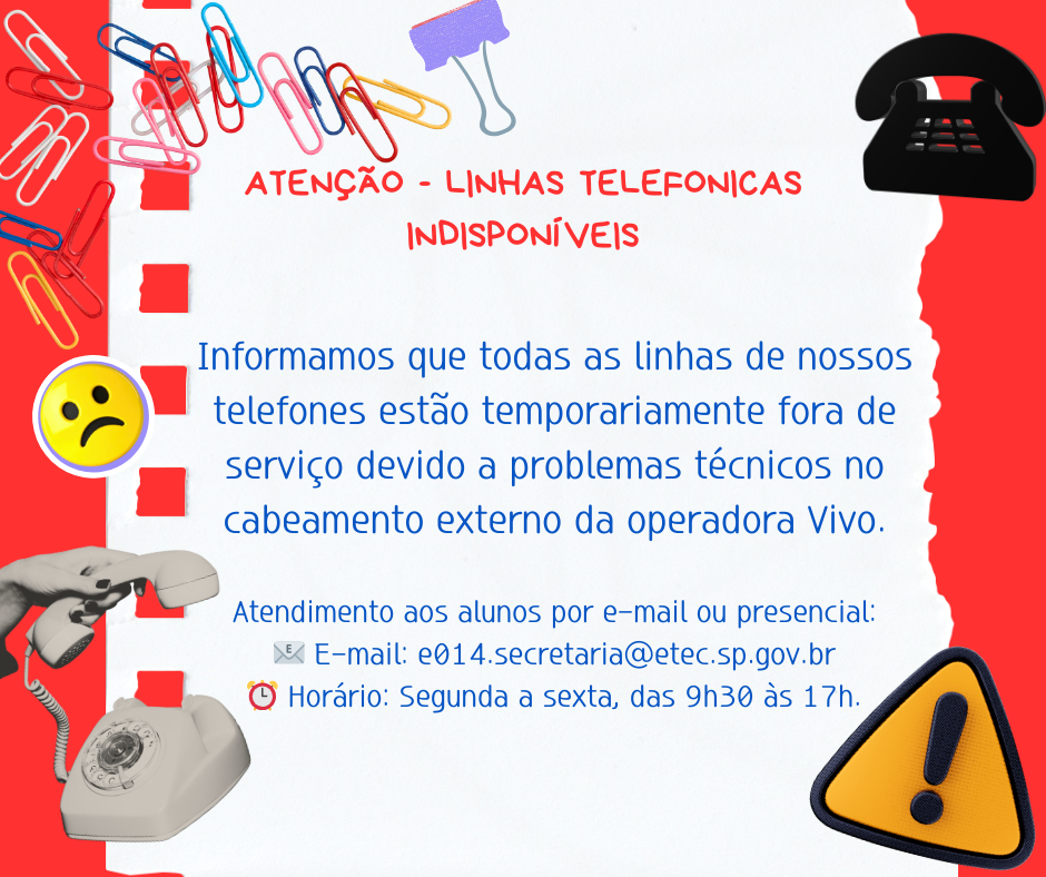 ⚠️ COMUNICADO Atendimento Telefônico Etec Júlio de Mesquita Informamos que nossos telefones estão temporariamente fora de serviço devido a problemas técnicos no cabeamento externo da operadora Vivo. Para garantir que você não fique sem suporte, […]