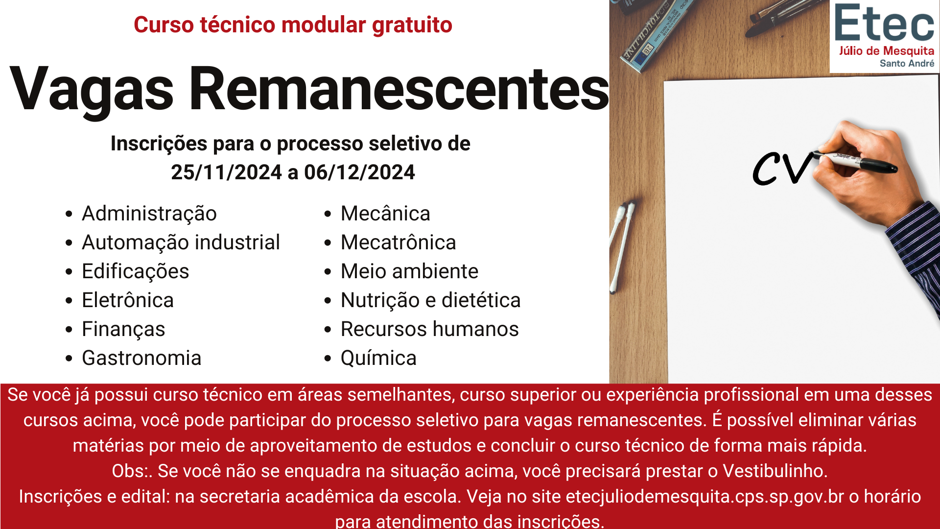 As vagas remanescentes são abertas para pessoas que já tem alguma experiência na área e buscam a certificação, ou que já estudaram, mudou a grade e não concluíram esse curso, ou ainda, para terem aproveitamento de estudos do módulo, através de outros cursos realizados correlatos ao mesmo eixo tecnológico ou da área Profissional.